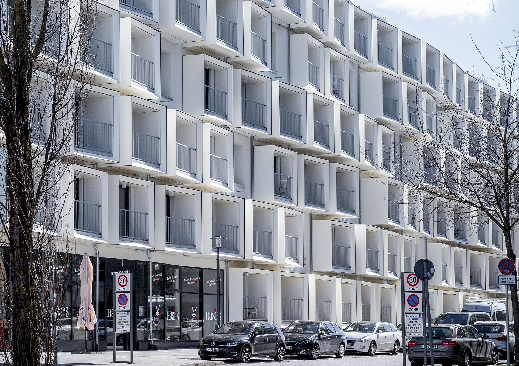 Die besondere Architektur aus der Feder des renommierten Münchner Büros Kupferschmidt Architekten zieht mit ihrer dynamischen Formensprache und den raffinierten Details alle Blicke auf sich. Die reliefhafte Fassade erzeugt mit Variationen von Vor- und Rücksprüngen sowie kippenden Flächen ein spannendes Licht-und-Schatten-Spiel. Die Loggien und Freissitze der einzelnen Apartments treten durch Bänderung und Kanten hervor und unterstützen das Leitmotiv der modellierten, Wellen erzeugenden Wand. Gedeckte Weiß- und Grautöne verbinden sich mit anthrazitgrauen Profilen zu einem zeitgemäßen, markanten Auftritt.